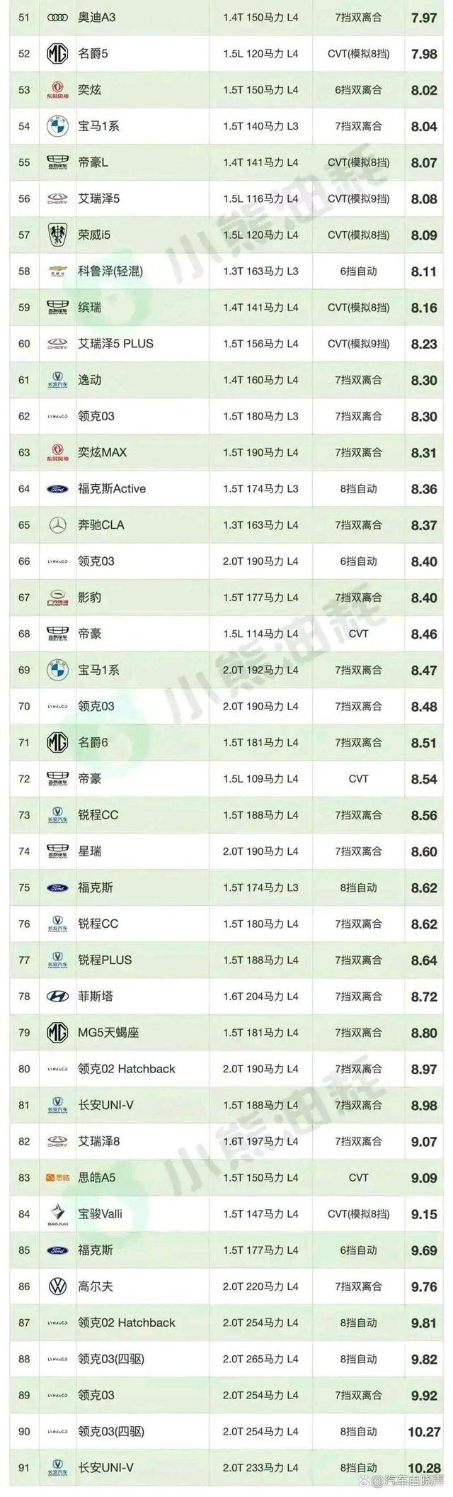 最后再来看看51-91名,油耗从7.97-10.28个,奥迪A3和名爵5油耗低于8个。艾瑞泽5PLUS、长安逸动、领克03、帝豪L和影豹等等车型油耗中规中矩。值得一提的是领克03是油耗最低的2.0T紧凑型轿车,百公里综合油耗只要8.48个。宝马1系、吉利星瑞、领克02这几款2.0T车型,油耗也都低于9个。油耗高于十个只有两款分别是领克03(四驱)和长安UNI-V,其中长安UNI-V油耗最高,百公里综合油耗10.28个。