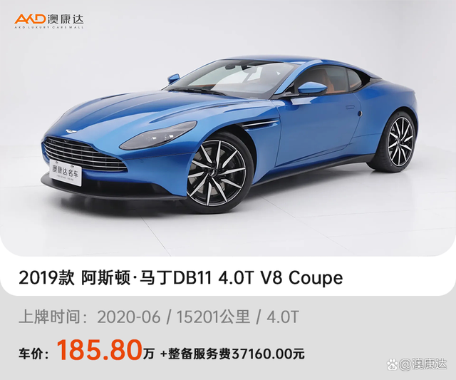 这辆2019款 阿斯顿·马丁DB11 4.0T V8 Coupe既能给到你浑厚的排气声浪,又能保证长途旅行的舒适性,完全是一款极具代表性的豪华GT跑车!这台车还选配了双色真皮内饰、座椅内侧星空打孔、前排通风座椅、阿斯顿·马丁翼型头枕刺绣、B&O音响、10辐定向黑色高光-钻石银双色轮毂等,约1.5万公里,目前仅售185.8万!