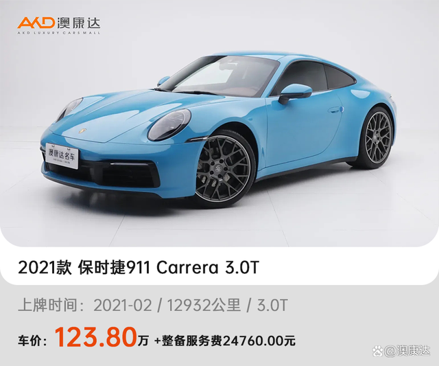 基础的3.0T H6双增压发动机就能做到4.2秒的破百能力,而像这台选配了Sport Chrono组件之后,直接进入“3秒俱乐部”,快到令人恐惧,而与此同时,它还有着“更易于驾驶”的特点,真的很夸张,简单而言,基础版的911 Carrera就能满足绝对部分人的用车需求了!这辆911选择了迈阿密蓝车漆与波尔多红内饰的搭配,以及前20/后21英寸轮毂、运动排气(黑色尾管)、全景影像、BOSE音响等配置,并还有透明车衣,目前的售价为123.8万!