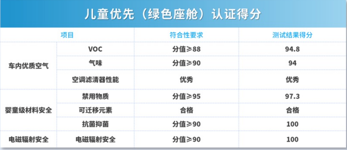 更科学的设计,更优质的用料,在中汽研关于座舱内婴童级材料安全评价中,蓝山的健康座舱以禁用物质评价分值97.3,可迁移元素评价合格、抗菌抑菌性评价分值100的成绩成功通过认证。