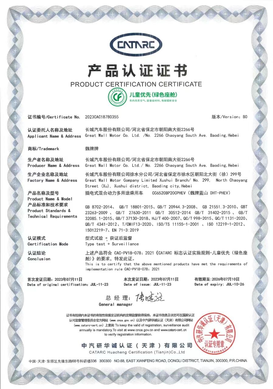 在此次中汽研关于座舱内优质空气评价中,蓝山的健康座舱以VOC评价分值94.8、气味评价分值94,空调滤清器评价为优秀的成绩成功通过认证。
