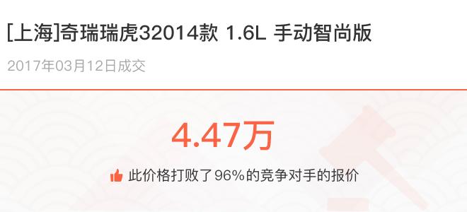 下面一起来看下开了不同公里数的奇瑞瑞虎3在二手车拍卖平台上卖了多少钱: