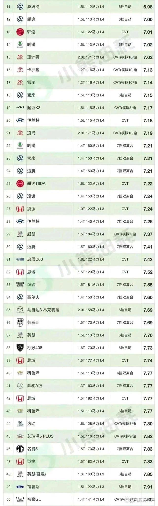 再来看看11-50名,油耗从6.98-7.96个,整体油耗差距并不大。大众桑塔纳排名第十一位,百公里综合油耗6.98个。别克威朗、本田思域、本田型格、标致408这些1.5T的车型油耗也都低于8个。自主品牌中荣威i5、吉利缤瑞、名爵5和帝豪GL这些涡轮车型,看的出来油耗不输于合资车。
