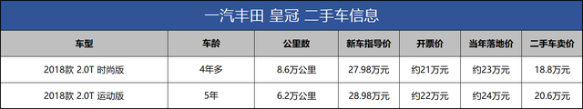 根据我们调查情况来看,目前国内二手第十四代丰田皇冠车源还算丰富,从2015年之后的不同年代款车型都有,但相对来说,停产之前的2018款丰田皇冠车源最丰富,关注度也最高。具体来看,车龄4年多,行驶里程近9万公里的次低配,二手车价格接近19万元,当年新车指导价近28万元;车龄5年,里程数6万多公里的中配车型,二手车价格在20万出头,当年新车指导价近29万元。