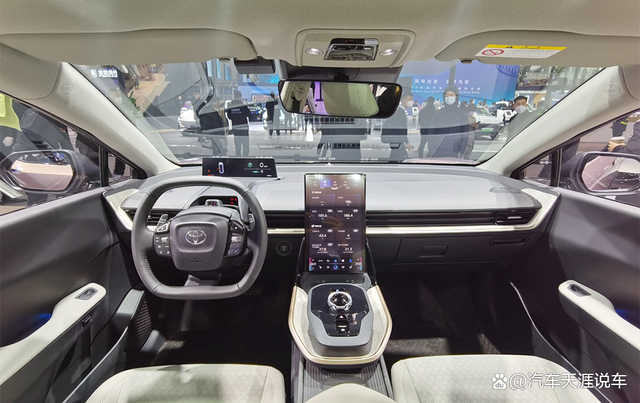 内饰设计上,贯穿式出风口、大尺寸的竖状中控屏、高位液晶仪表盘,看上去比较简洁,但却过于简单了,20万级别的纯电车,没有太多的质感,很是符合丰田一贯的风格。