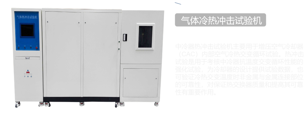 最近这段时间很热,真的热,深圳的气温高达30摄氏度以上,所以在开车或者坐车的时候,空调冷气就是一根救命稻草,那么在汽车制造过程中,中冷器热冲击试验机是测试汽车冷气系统的设备,主要用于增压空气冷却器(CAC)内部空气冷热交变循环试验,热冲击试验是用于考核中冷器抗温度交变循环性能的强化试验,为冷却器的设计提供试验数据,也可验证冷热交变温度时非金属与金属连接部位的可靠性,对保证热交换器质量和提高其可靠性有重要作用。